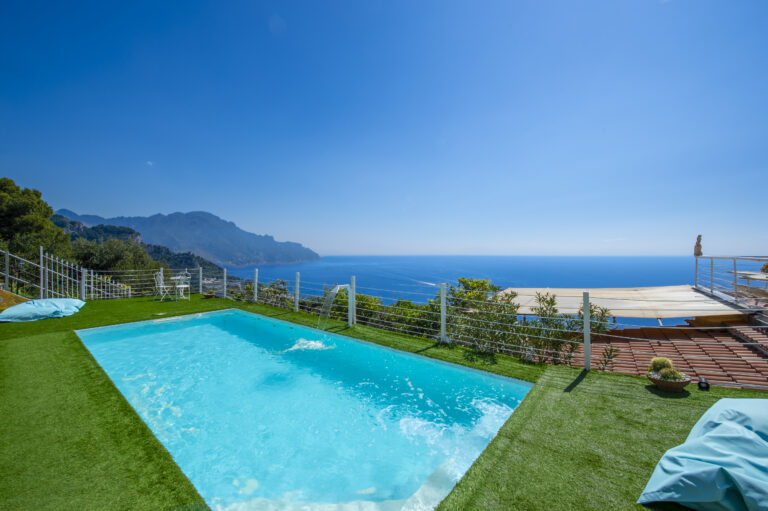 Villa con piscina panoramica ad Amalfi, affacciata sul mare e circondata dalla natura mediterranea.
